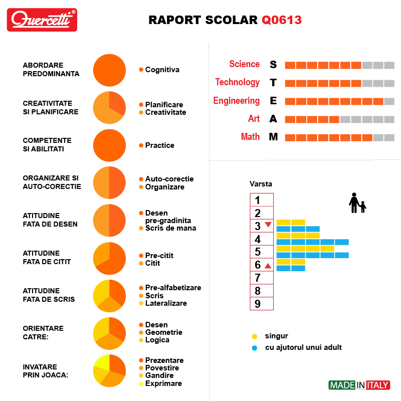 60 de ani de experienta Quercetti. Toate jucariile Quercetti sunt facute pentru a stimula creativitatea si intuitia copiilor prin joaca. Creativitatea este un element esential pentru a spori dezvoltarea sanatoasa, iar prin jucariile Quercetti, copiii dezvolta noi abilitati fizice si mentale si de asemenea invata sa rezolve probleme. Cu Quercetti, copiii se joaca inteligent!