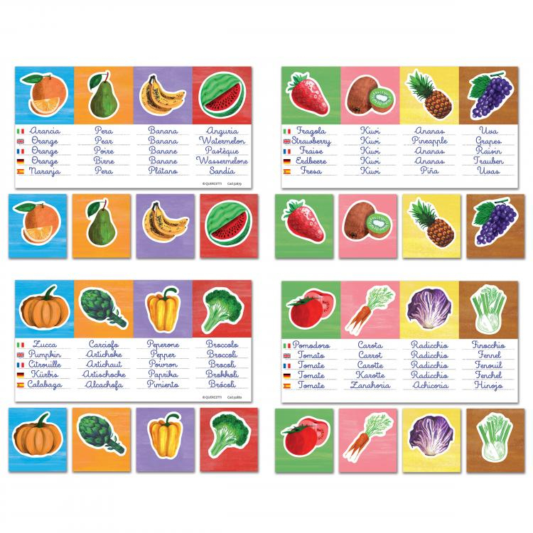 Un joc de ordonare si asociere care ii invata pe copii sa cunoaca fructele si legumele si denumirile lor in alte 5 limbi straine.' Doua planse colorate mari arata imagini cu fructe si legume, impreuna cu denumirile lor in cele 5 limbi.' Copilul trebuie sa potrivesca plansa mica cu imaginea corespunzatoare de pe plansa mare.