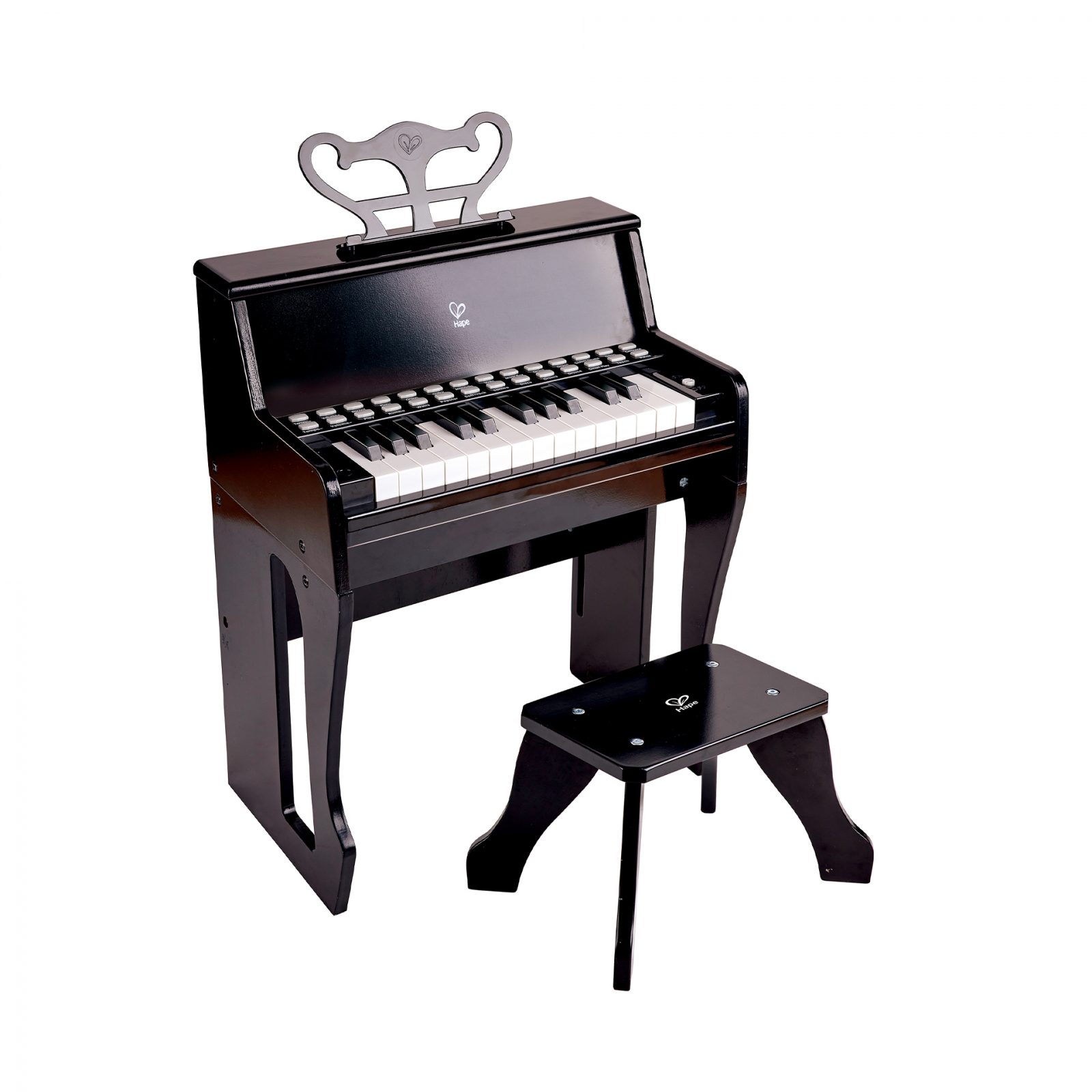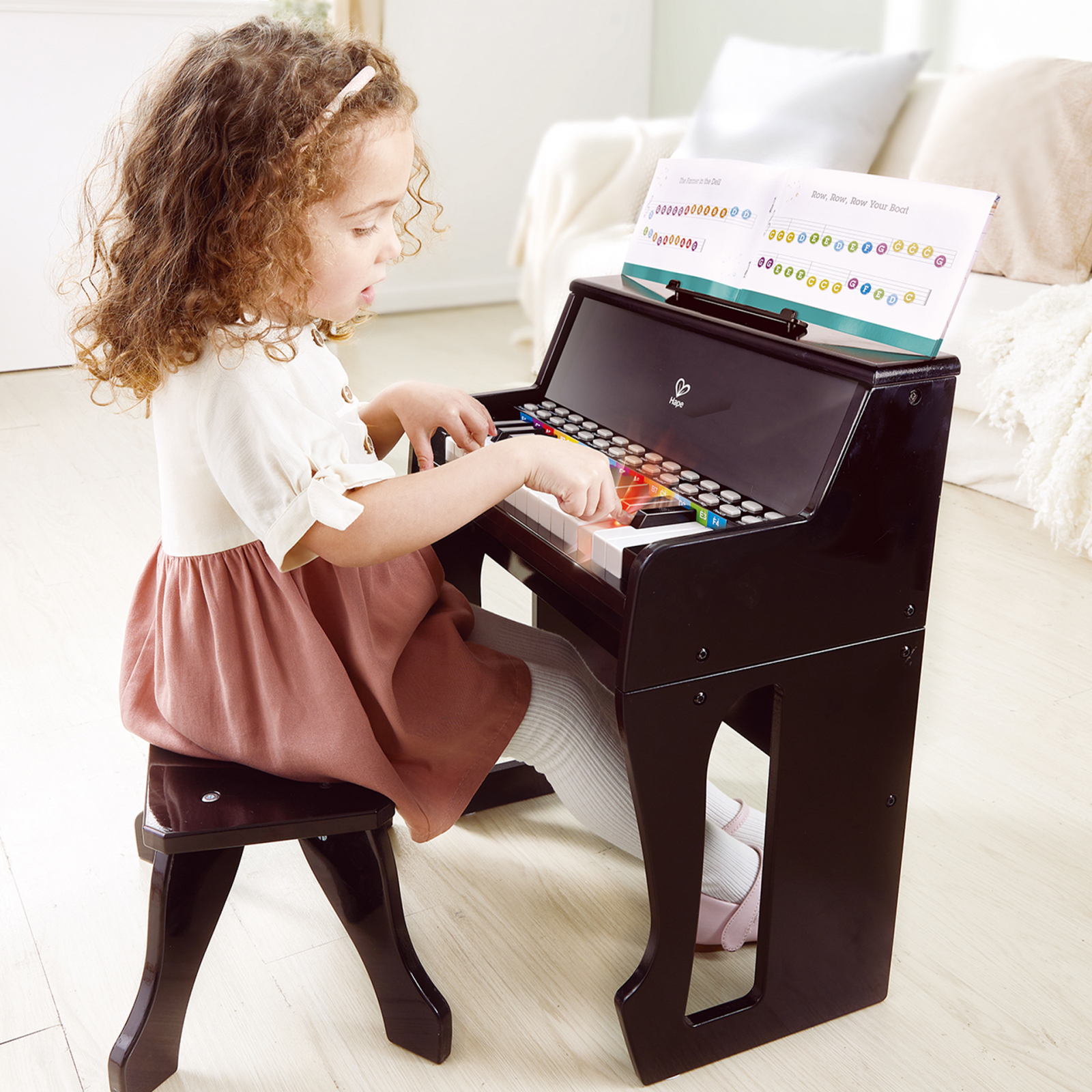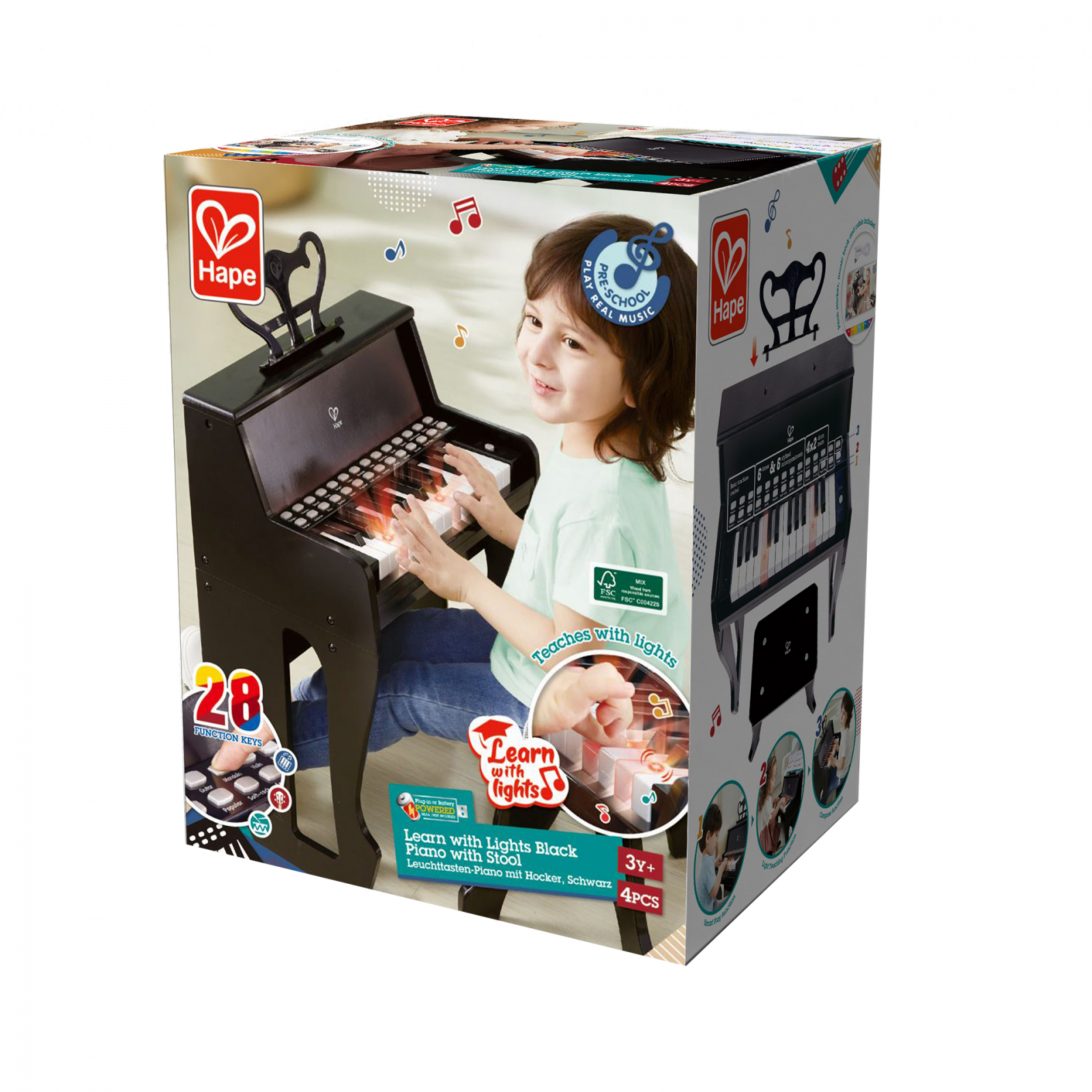 Pian electric cu 25 de taste, cu taste iluminate. Alimentat de 4 baterii AA (incluse) sau cablu USB inclus. Urmati tastele luminoase pentru a invata cum sa cantati, apoi cand sunteti mai increzator, puteti sa va selectati propriul instrument si sa cantati impreuna cu una dintre cele sase melodii stilizate si opt batai de tobe cu tempouri reglabile.