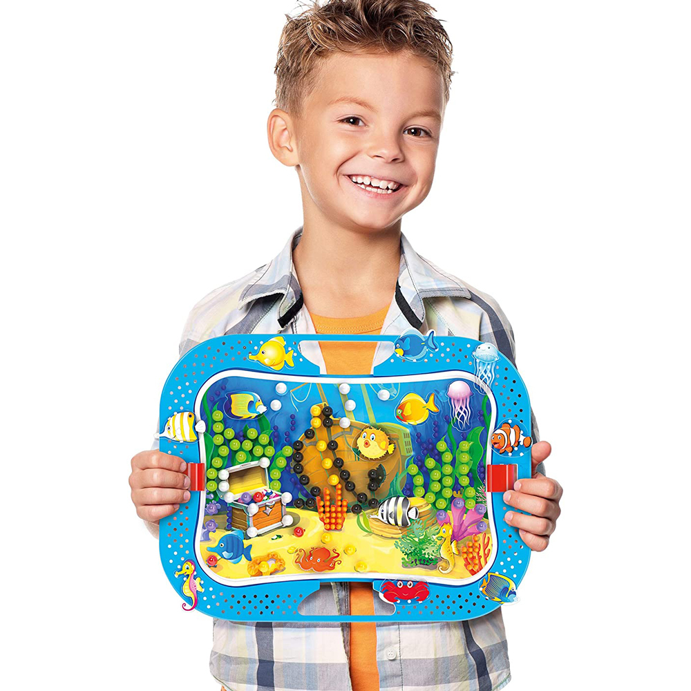 Kitul de joc include o plansa perforata care se fixeaza pe o baza cu suport, piese mozaic tip ,,peg,€#8482;,€#8482; in 6 culori si dimensiuni diferite, 2 sabloane ilustrate cu imagini din lumea subacvatica si stickere cu animale marine, ce stimuleaza imaginatia copiilor pentru a crea un mediu natural.