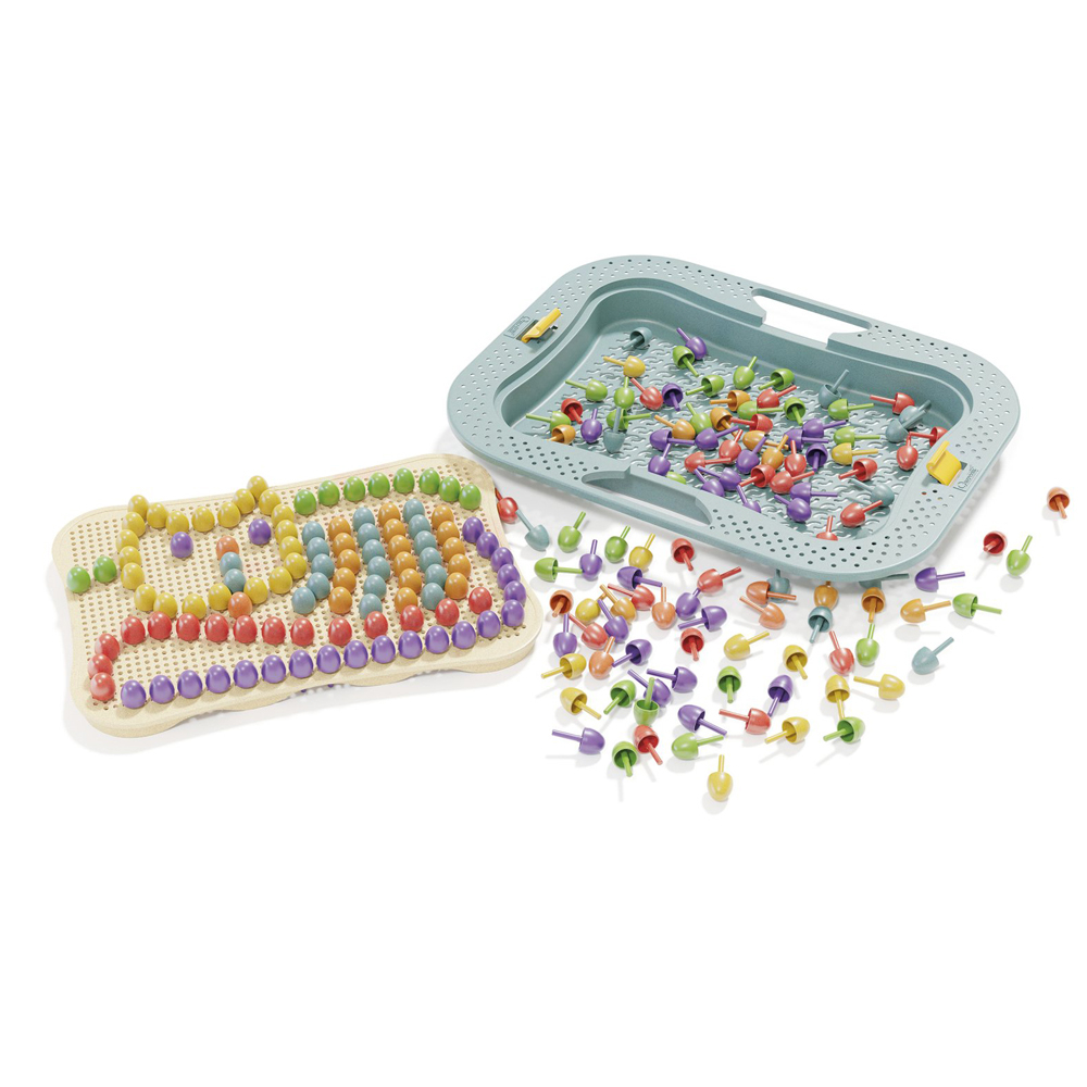 Cu ajutorul acestui joc copii pot crea mozaicuri minunate. Rama exterioara a noului joc din gama FantaColor Design are margini rotunjite si gauri in care se pot baga piesele tip Peg pentru a avea spatiu pentru si mai multa creativitate. Plansa de joc poate fi pozitionata si orizontal si vertical, rezemandu-se pe baza, la fel ca o rama de tablou, astfel incat opera celui mic sa poata fi admirata in toata frumusetea ei! Manerul de transport face jocurile din gama FantaColor Design usor de transportat in vacanta. In cutia speciala, piesele de mozaic tip Peg pot fi usor depozitate si transportate.