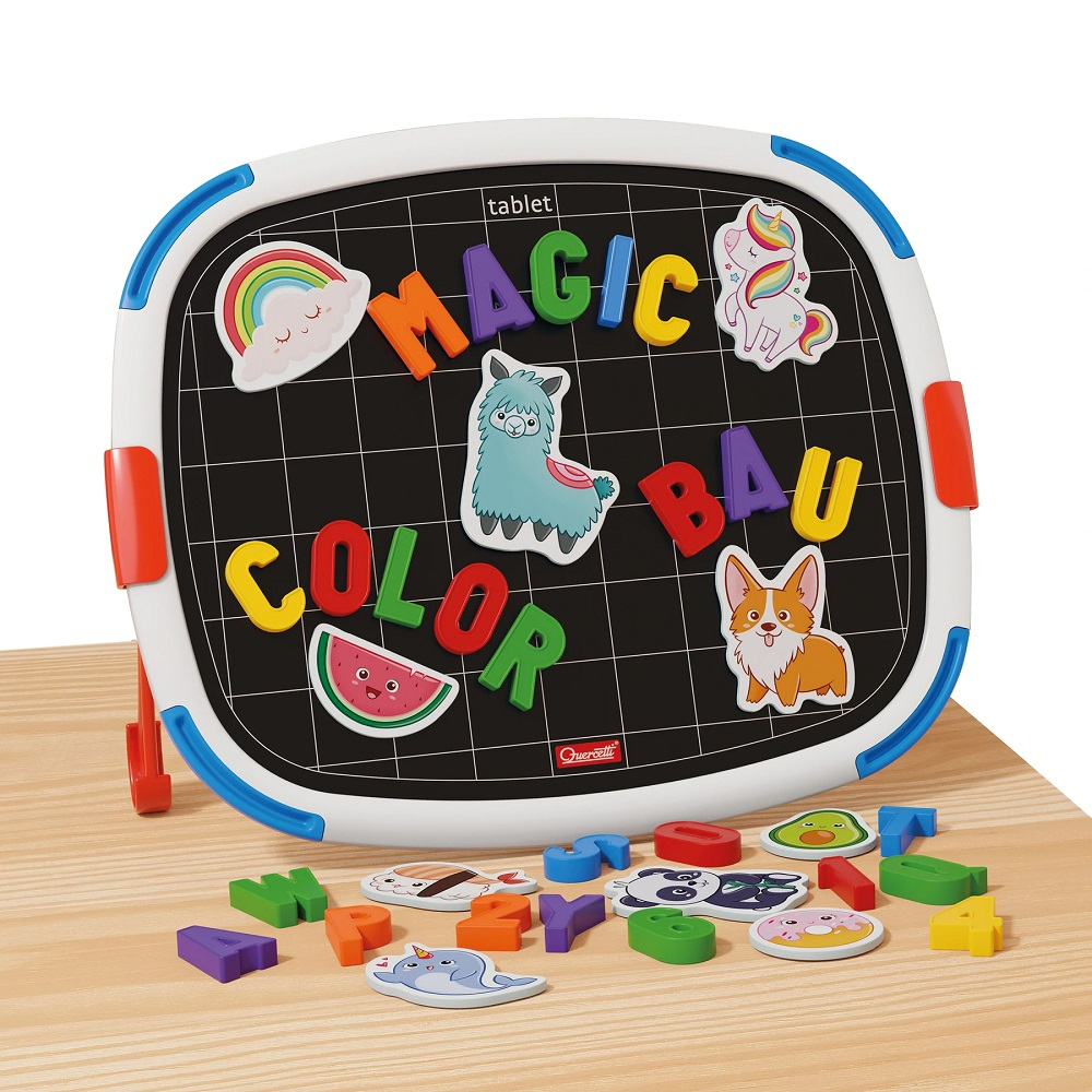 Iata noua linie de tablete magnetice cu doua fete de la Quercetti, cu forma rotunda originala. Marginile netede sunt protejate cu insertii colorate din cauciuc rezistent la socuri, un joc complet sigur pentru copii.' Utilizati ambele parti ale tabletei, fie folosind literele magnetice, fie desenand si scriind cu markerul.' Setul include o selectie de ilustratii magnetice din carton robust, concepute special pentru a incuraja ortografia unor cuvinte usoare intr-un mod distractiv.' In plus, un accesoriu util poate fi fixat pe rama pentru a pastra intotdeauna radiera si markerul la indemana iar cele doua suporturi permit plasarea tabletei atat pe verticala, cat si pe orizontala.