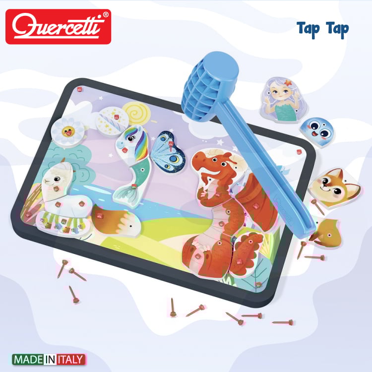 Exprima-ti toata creativitatea si compune animale fantezie! Folosind cuie speciale si un ciocan solid din plastic, cele 36 de placi ilustrate pot fi fixate, reasambland diferite animale sau inventand altele noi. Cuiele din plastic create exclusiv de producatorul italian Quercetti, fixeaza placile din material moale Eva pe toata suprafata.