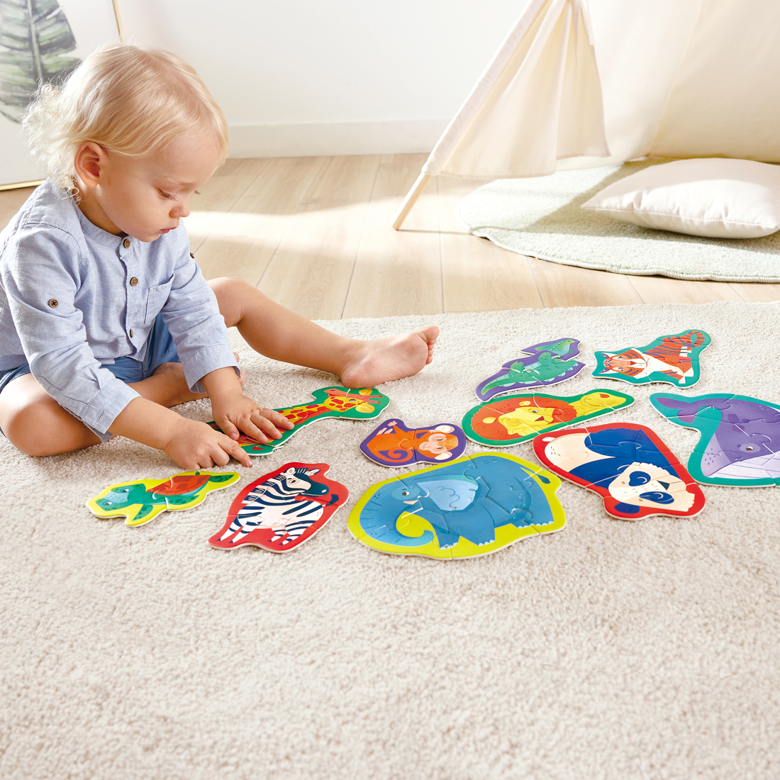 Acest set de puzzle include zece puzzle-uri cu animale exotice in forma de zebra, girafa, balena, panda, leu, tigru, maimuta, testoasa, elefant si crocodil.