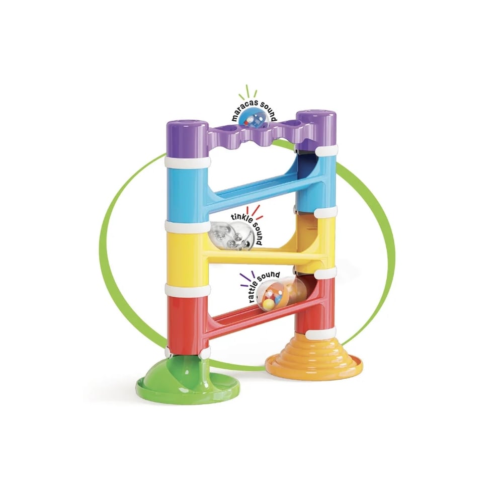 Setul include o pista captivanta si trei bile mari care produc sunete placute in timp ce se rostogolesc pe traseu. Copiii pot impinge bilele cu mana si se pot bucura urmarindu-le si ascultand sunetele pe care le fac in timp ce coboara pe turn.